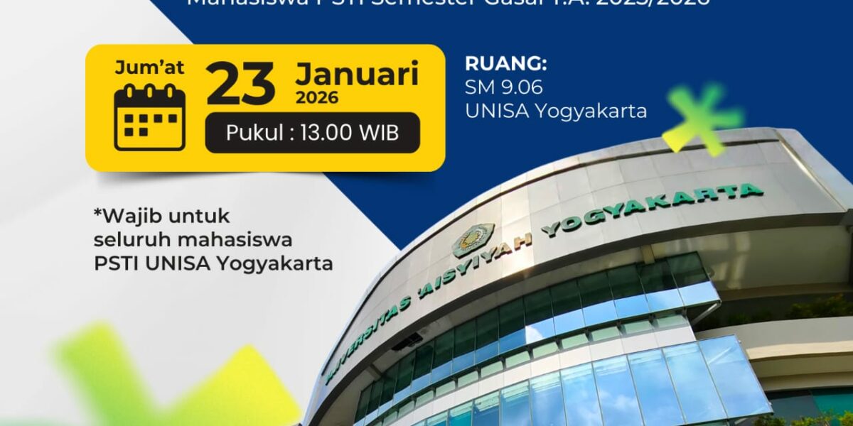 Yogyakarta, 23 Januari 2026 – Program Studi Teknologi Informasi (PSTI) Universitas ‘Aisyiyah (UNISA) Yogyakarta menyelenggarakan kegiatan Sarasehan Mahasiswa Semester Gasal Tahun Akademik 2025/2026 pada Jumat, 23 Januari 2026 pukul 13.00 WIB, bertempat di Ruang SM 9.06, UNISA Yogyakarta.